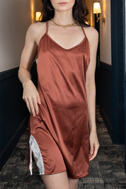 Mêlant une dentelle blanche française délicatement tissée, et un satin d’un terracotta flamboyant. La nuisette est agrémentée d’un profond décolleté envoûtant en dentelle blanche, à l’arrière.